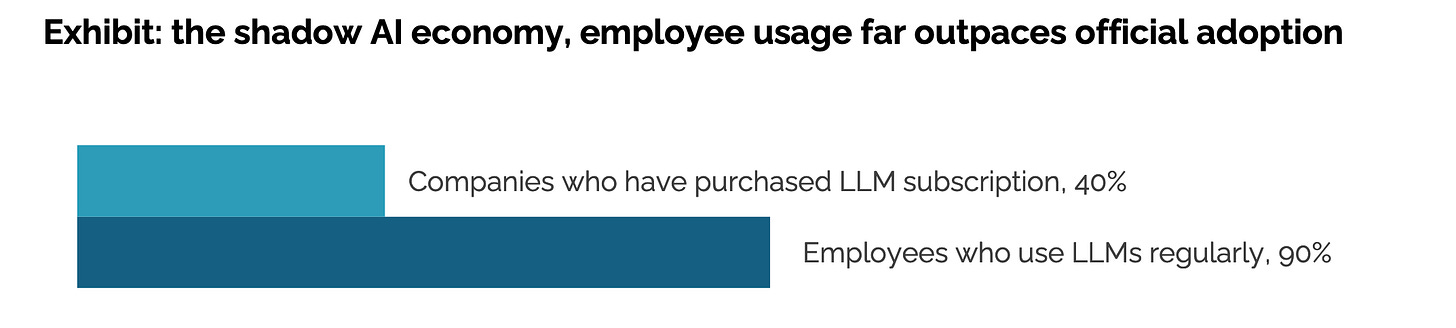 Also worth mentioning that one of the factors attributed to this low impact, relates to the fact that most capital has been allocated to Sales & Marketing Processes, while the study shows far better results in back-office automations. On top of this is quite interesting to see how AI might be delivering value for professional’s productivity in what they call “Shadow AI economy”, where instead of going with fancy AI Corporate solutions, professionals tend to have their own personal subscription.